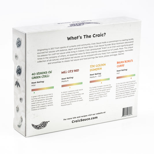 We take pride in crafting bold, flavor-packed sauces by embracing a hands-on approach—from growing and sourcing local ingredients to thoughtfully crafting each batch. We're not just making hot sauce; we're building connections with our community and creating sauces that bring a bit o' craic to your table!