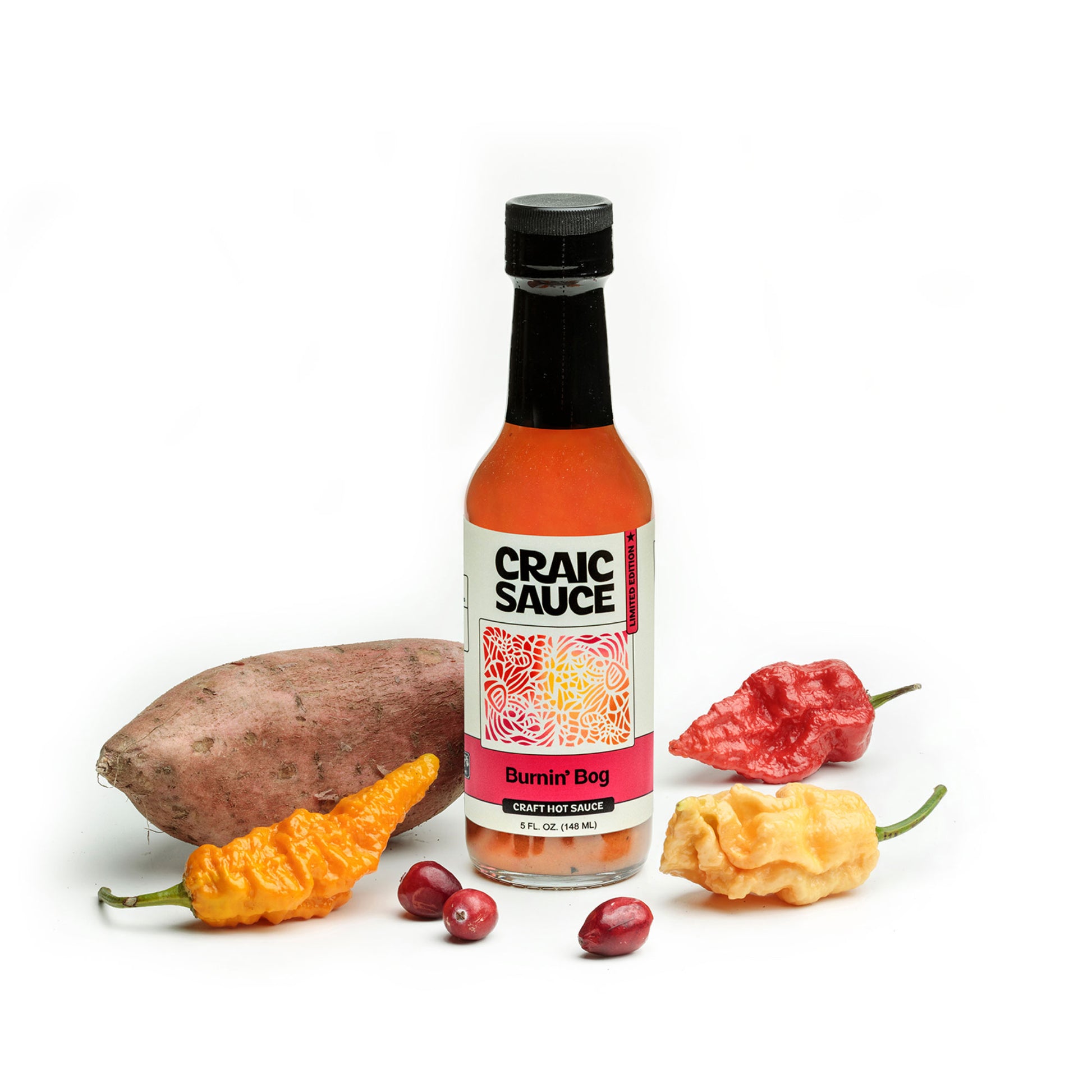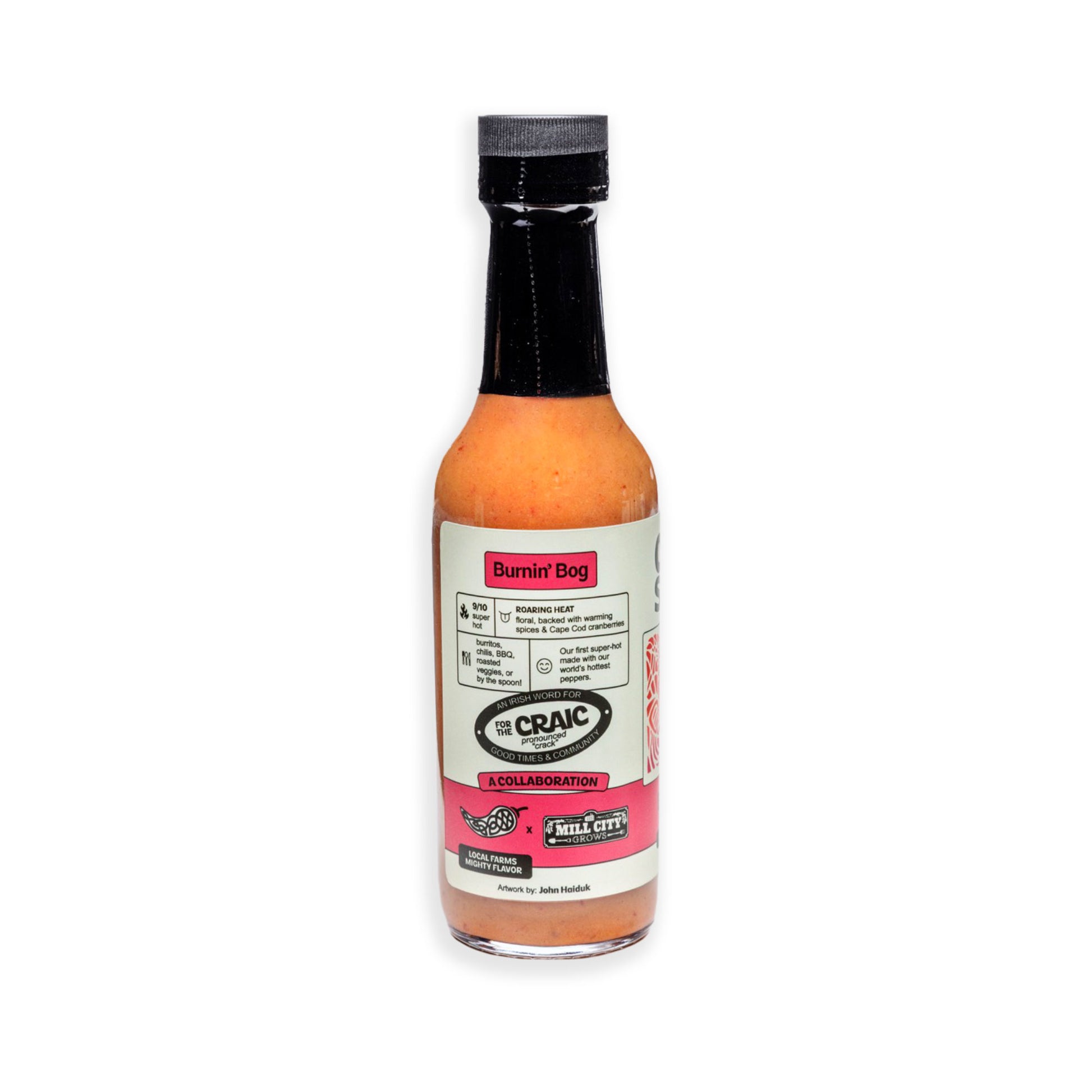 About the Sauce: Burnin’ Bog is our first super-hot hot sauce, combining the fiery heat of our own grown peppers—Apocalypse Scorpion, Death Spiral, Jay's Peach Ghost, and Carolina Reaper—all harvested at Mill City Grows in Lowell. Paired with the earthy, tart sweetness of fresh cranberries from Cape Cod, our hand-pressed Concord grape wine vinegar, roasted sweet potatoes, and fermented garlic honey, this sauce masterfully balances intense heat with bright, tangy flavors. A true celebration of bold spice and local harvests!