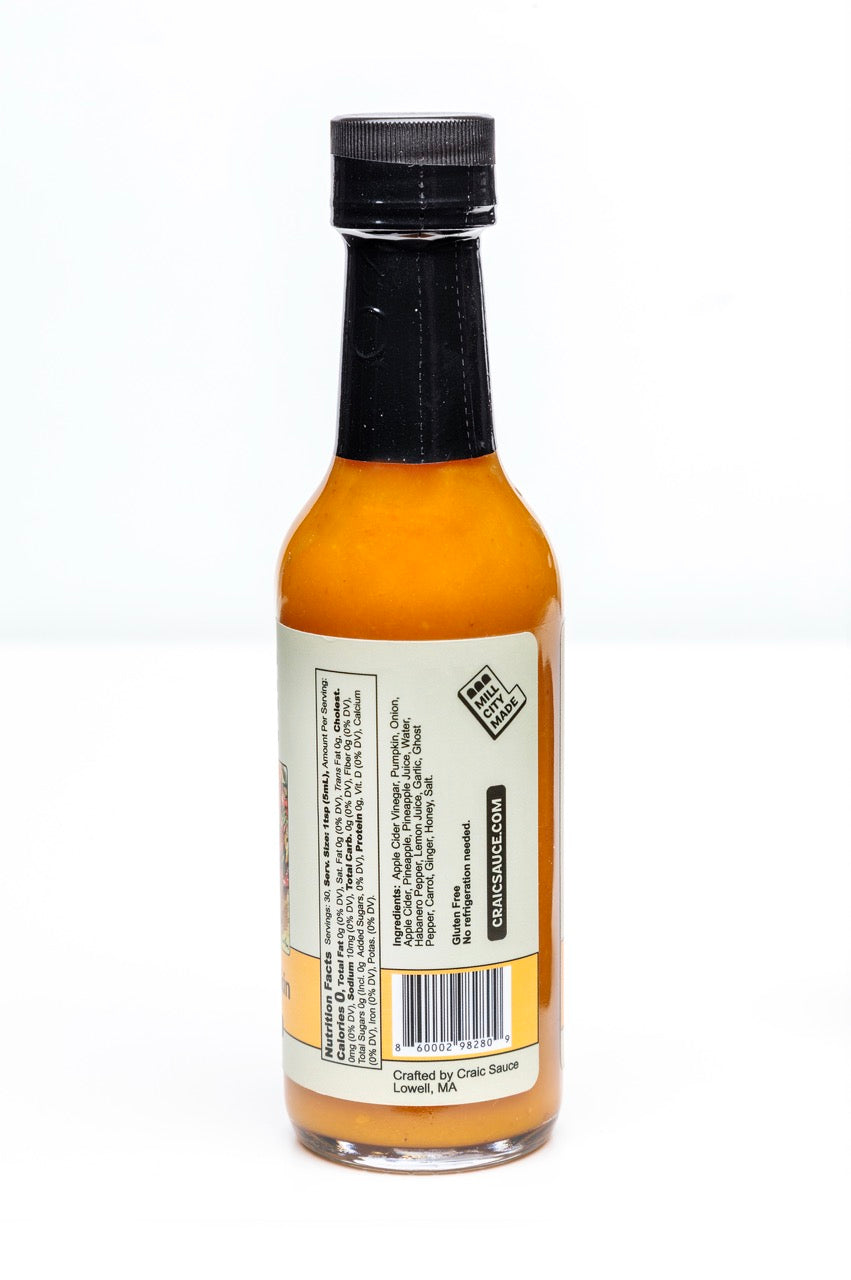 Ingredients: Apple Cider Vinegar, Pumpkin, Onion, Apple Cider, Pineapple, Pineapple Juice, Water, Habanero Peppers, Lemon Juice, Garlic, Ghost Peppers, Carrots, Ginger, Honey, Sea Salt